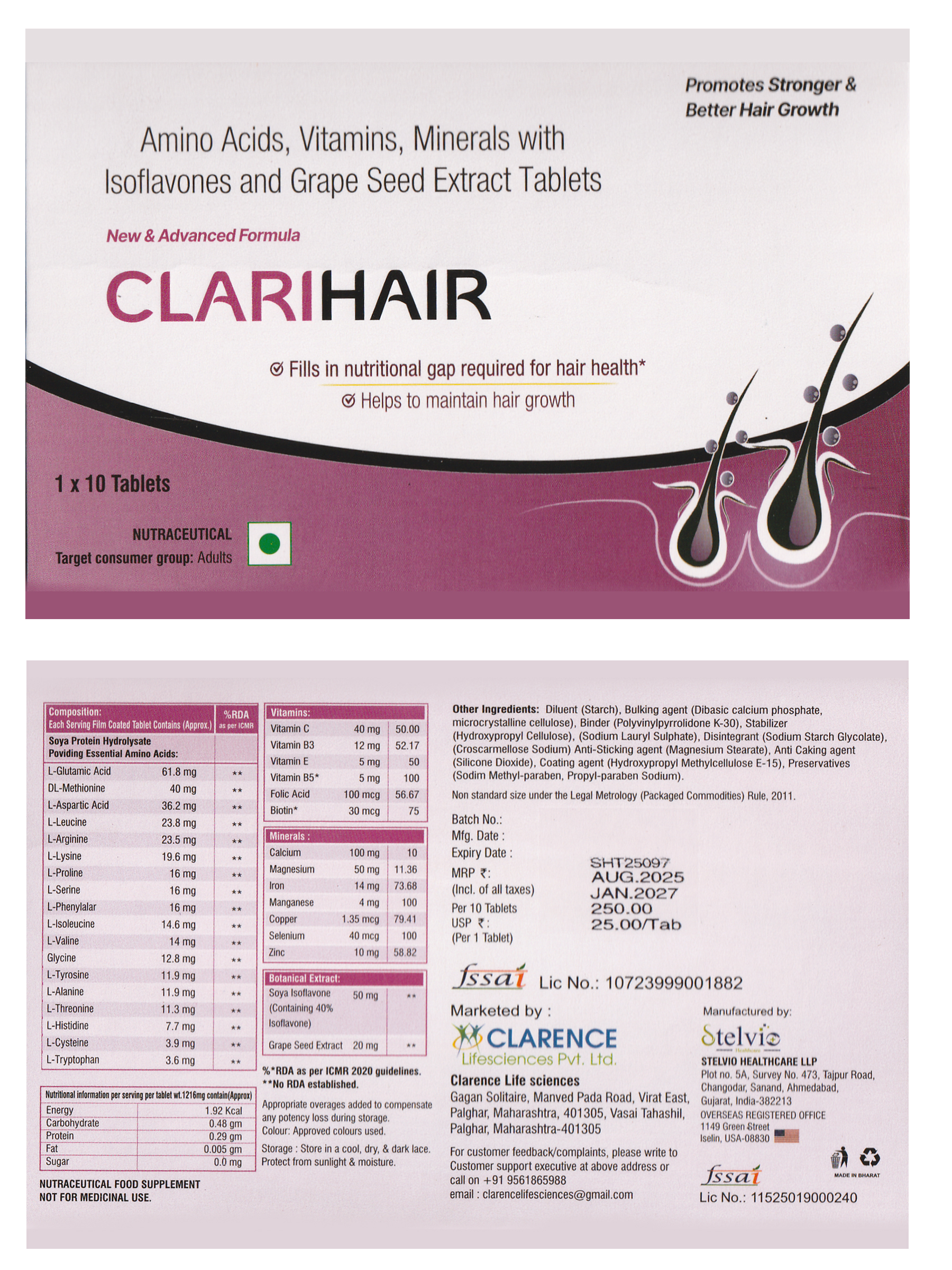 (L-Glutamic Acid-61.8 mg, DL-Methionine-40 mg, L-Aspartic Acid-36.2 mg, L-Leucine-23.8 mg, L-Arginine-23.5 mg, L-Lysine – 19.6 mg, L-Proline-16 mg, L-Serine-16 mg, L-Phenylalanine-16 mg, L-Isoleucine-14.6 mg, L-Valine-14 mg, Glycine-12.8 mg, L-Tyrosine-11.9 mg, L-Alanine-11.9 mg, L-Threonine-11.3 mg, L-Histidine-7.1 mg, L-Cysteine-3.9 mg, L-Tryptophan -3.6 mg. Folic Acid-100 mcg, Biotin-30 mcg, Calcium-100 mg, Magnesium-50 mg, Iron-14 mg, Manganese-4 mg, Copper-1.35 mg, Selenium-40 mcg, Zinc-10 mg, Soya Isoflavone-50 mg, Grape Seed Extract-20 mg Vit. C-40 mg, Vit. B3-12 mg, Vit. E-5 mg, Vit. B5-5 mg Tablet)