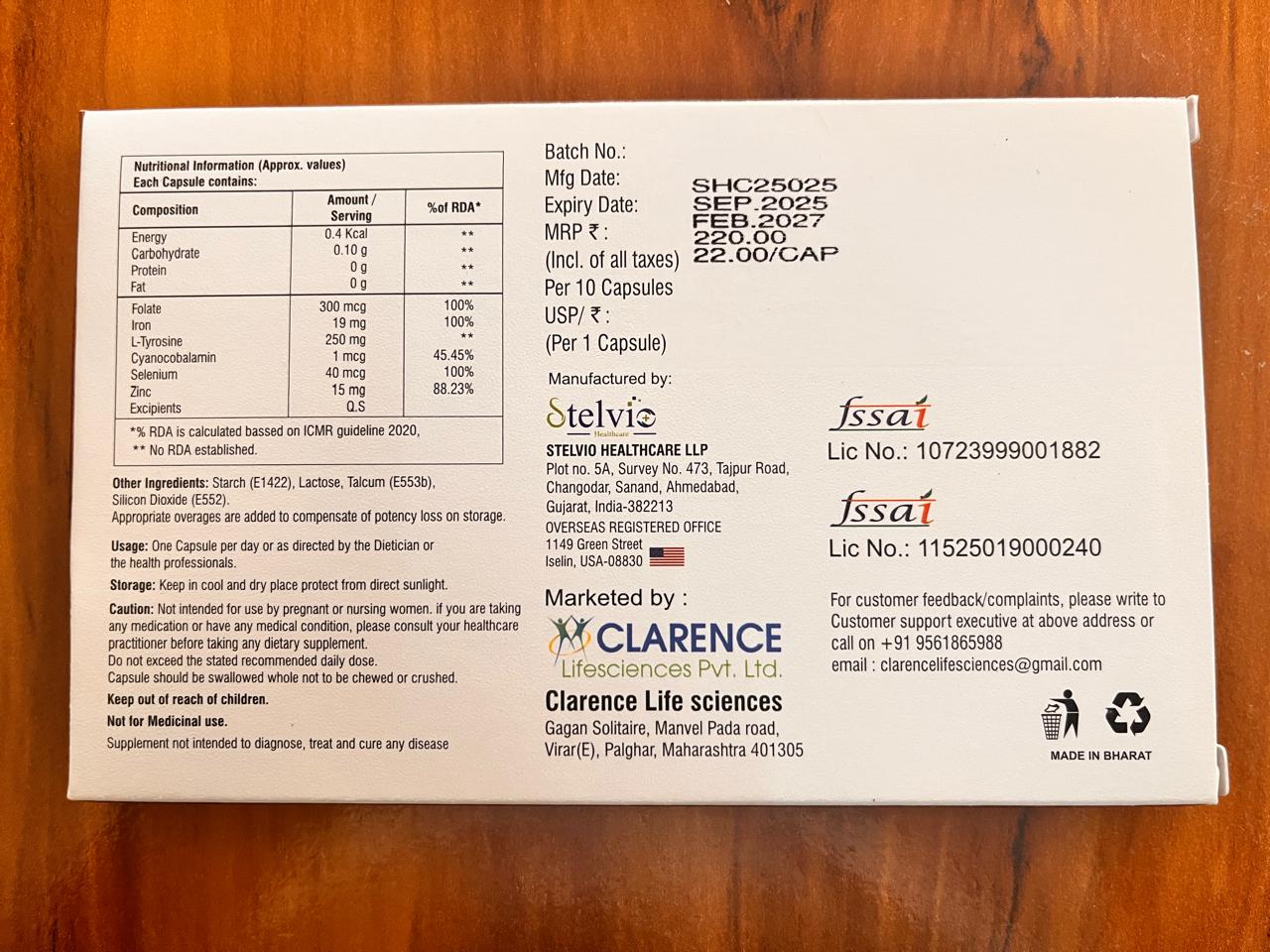 (Folate 300mcg, Iron 19mg, L-Tyrosine 250mg, Cyanocobalamin 1mcg, Selenium 40mcg, Zinc 15mg Capsule)